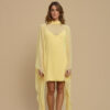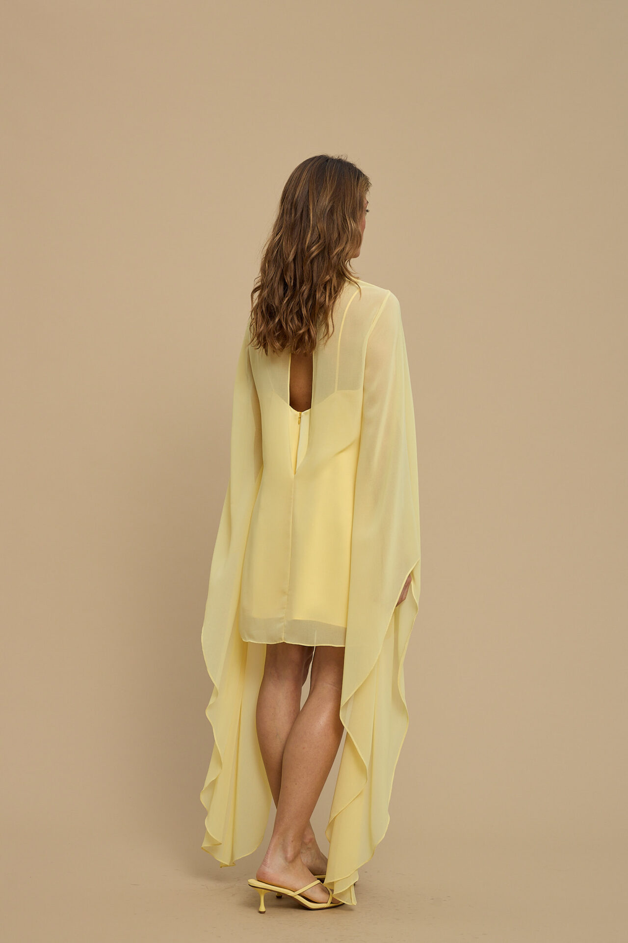 An ethereal mini dress with a layered cape covering the neck and sleeves.