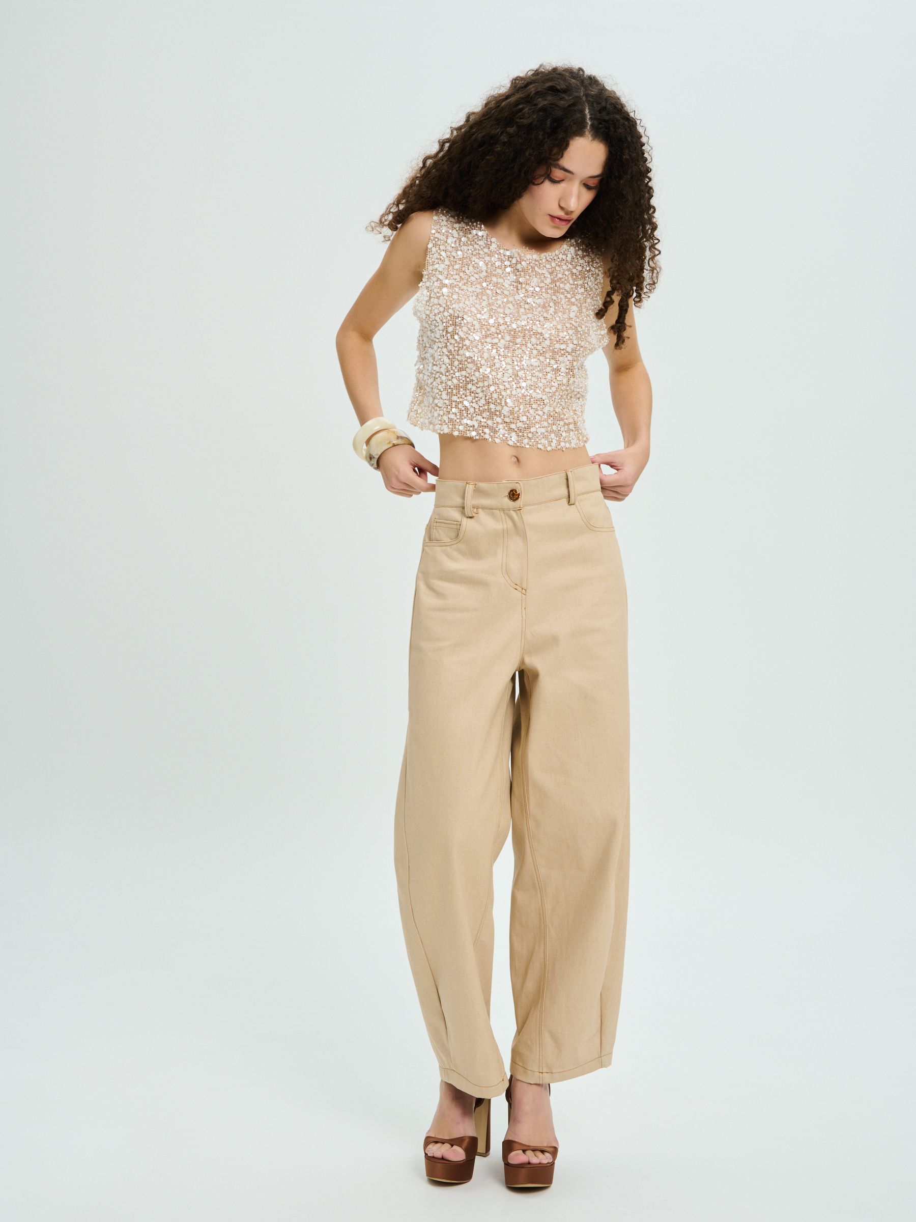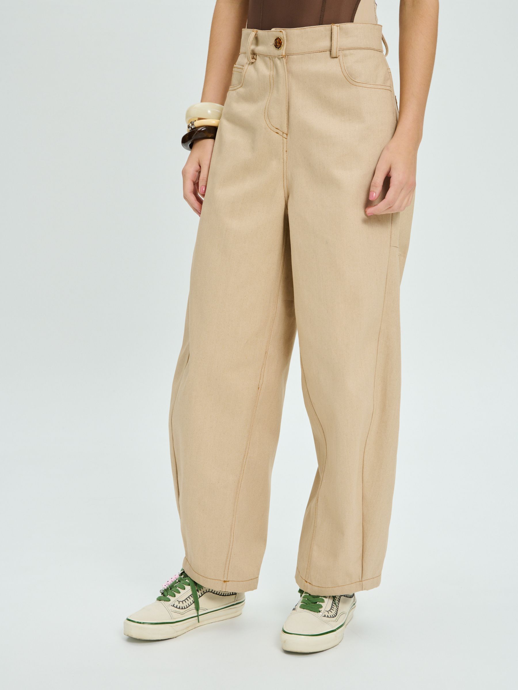 Το PROJECT SOMA Balm Beige Pants κατασκευάζεται από χρωματιστό bull denim ύφασμα. Barrel παντελόνι με διακοσμητικές ραφές.