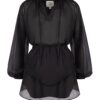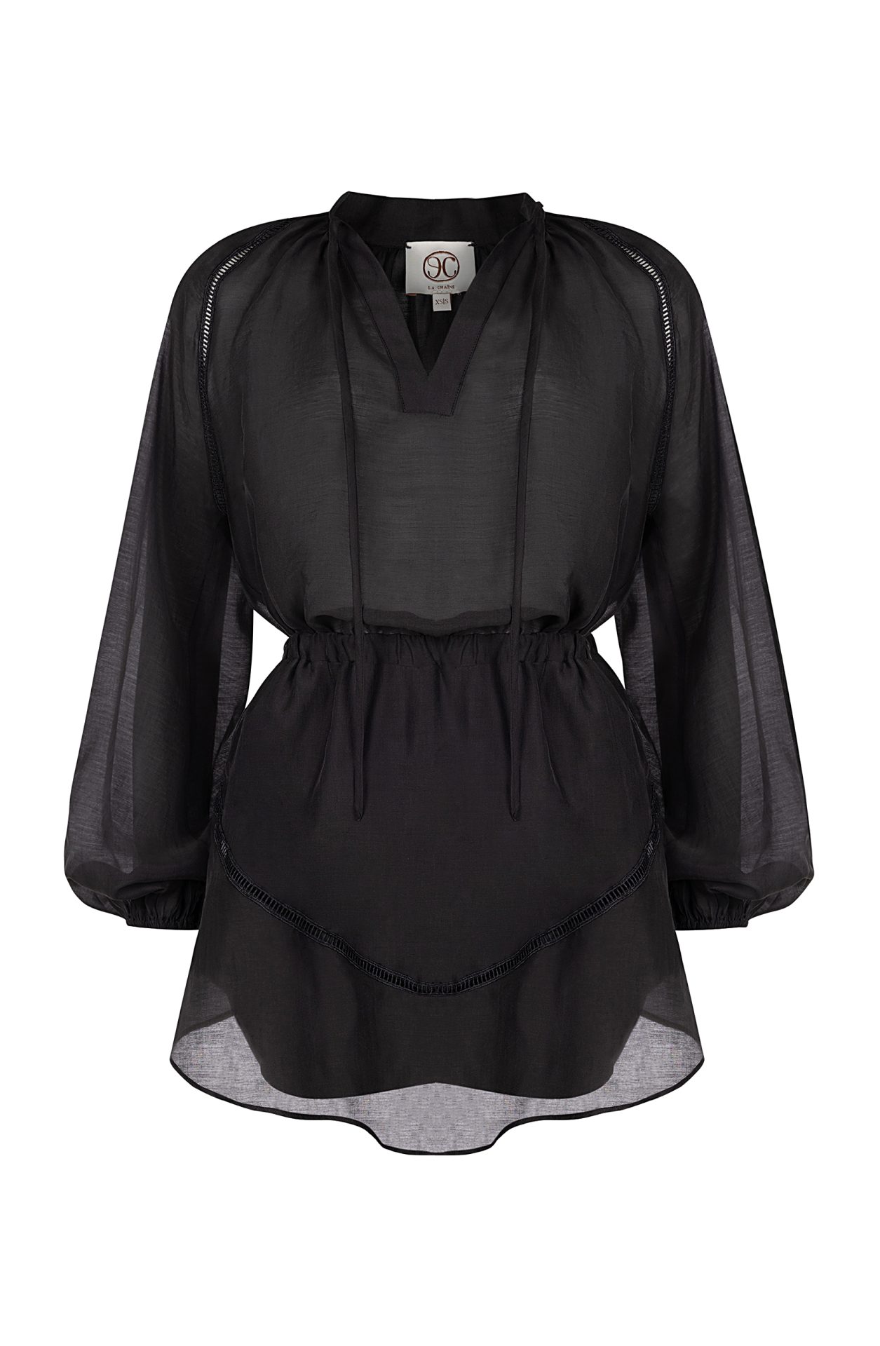 A sheer blouse shirt with an oversized fit and V neckline with strings to tie.