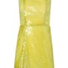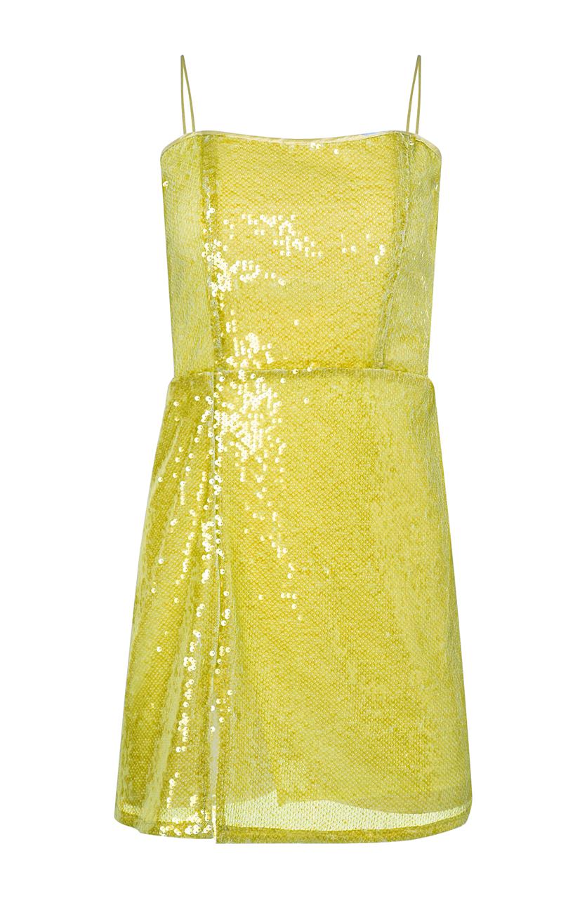 A mini sequined dress with thin straps, square décolleté & side cut.