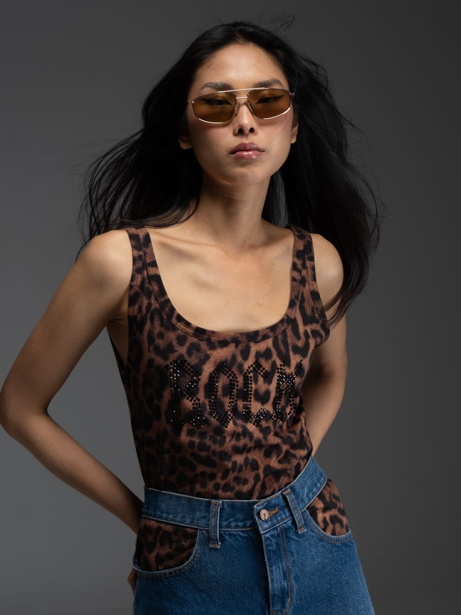 Το ιδιαίτερο leopard print της χαρίζει δυναμικό χαρακτήρα, ενώ οι μαύρες λεπτομέρειες με στρας προσθέτουν πιο rock αισθητική και ξεχωριστό ύφος.