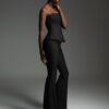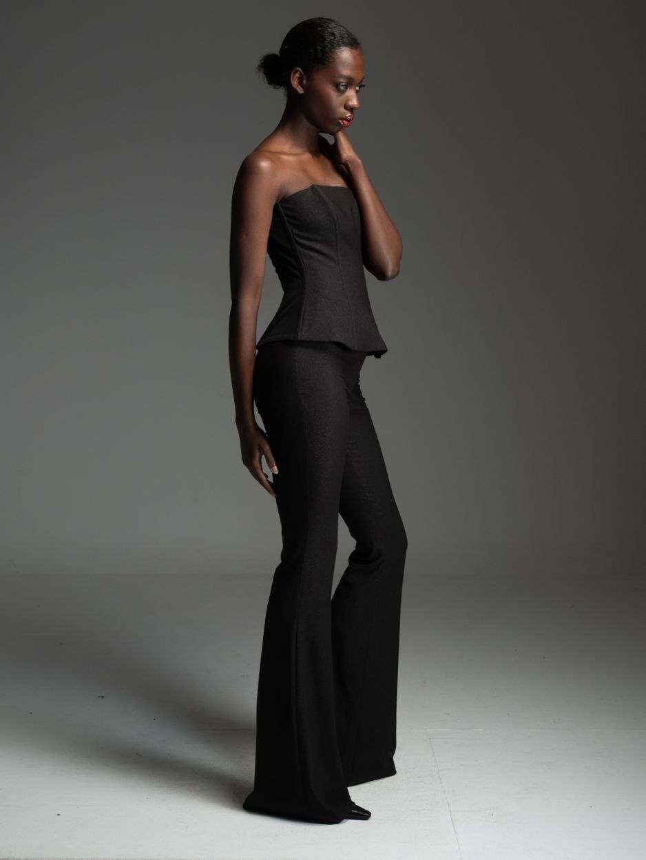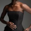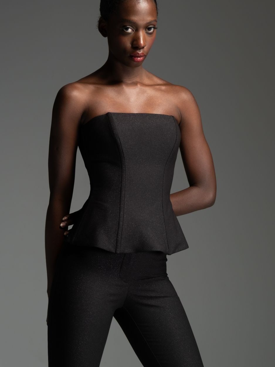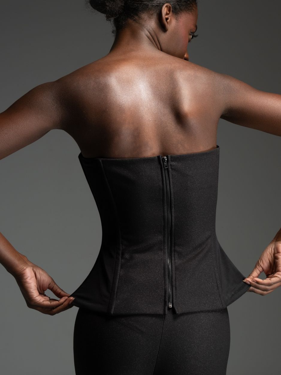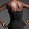 Μαύρο στράπλες κορσέ με μεσάτη γραμμή και μεταλλικές μπανέλες περιμετρικά που προσφέρουν σταθερότητα και καλοσχηματισμένη σιλουέτα.