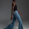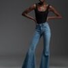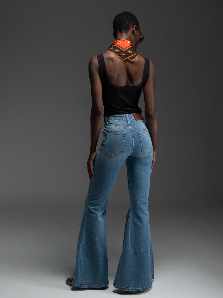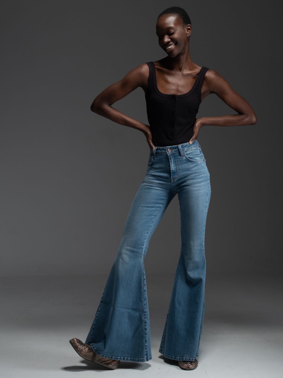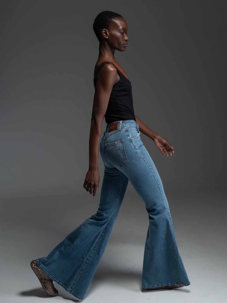 Μπλε ψηλόμεσο τζιν καμπάνα, σχεδιασμένο σε κλασική πεντάτσεπη γραμμή, από denim ύφασμα με ελαστικότητα που προσφέρει άνεση, σταθερότητα και απόλυτα κολακευτική εφαρμογή.