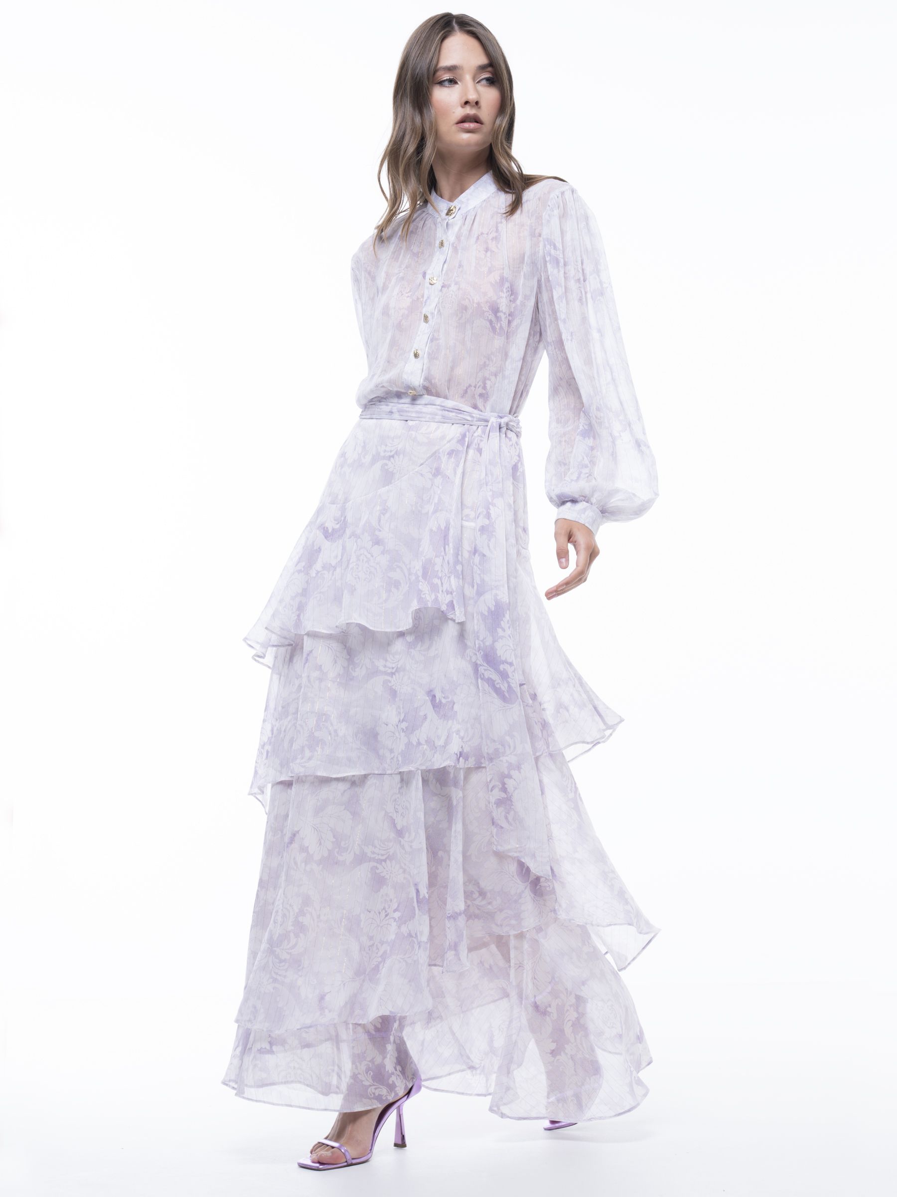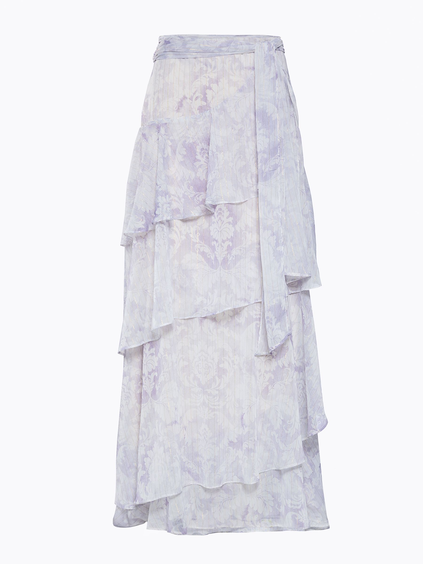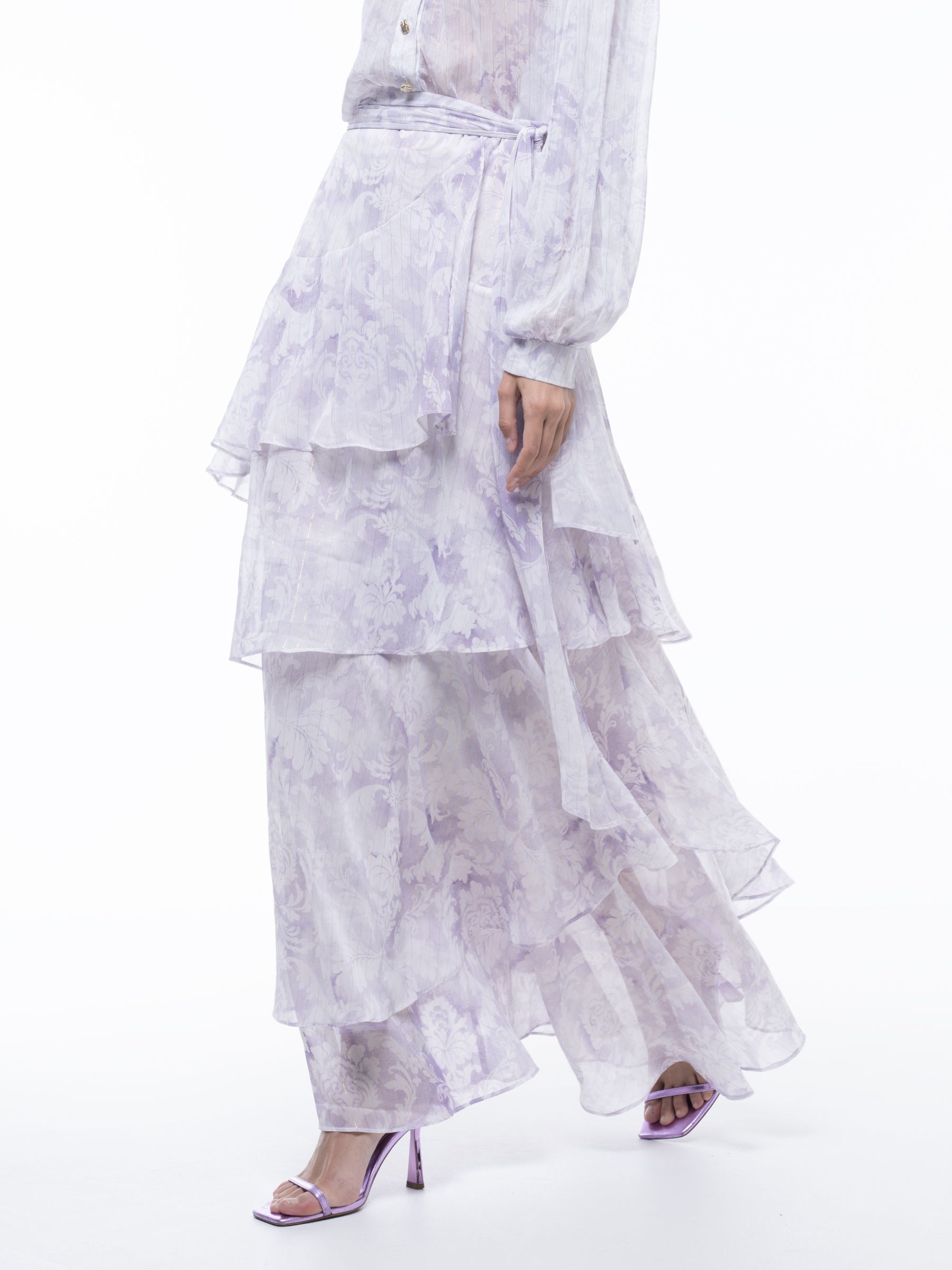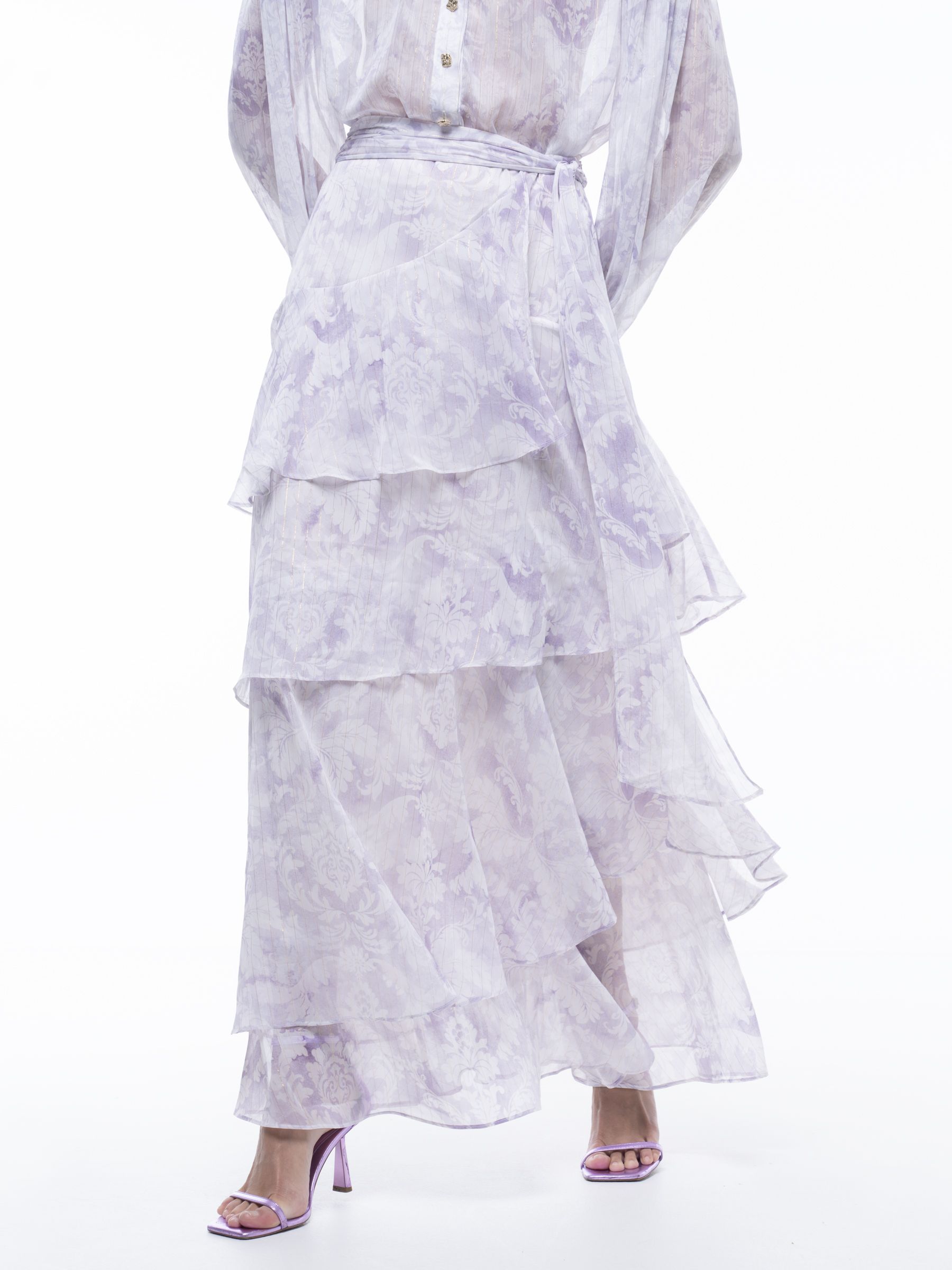 Η Project Soma UNGUES SΚIRT κατασκευάζεται από αέρινο ύφασμα με λεπτομέρεια λάμψης. Μάξι ασύμμετρη φούστα με βολάν και φερμουάρ στο πλάι και δέσιμο.